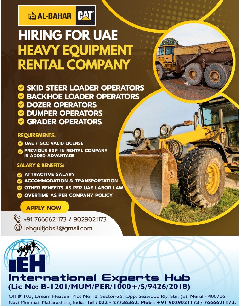 We are seeking experienced heavy equipment operators to join our team in the UAE. The ideal candidates will have a valid UAE/GCC license and previous experience working in a rental company. Attractive salaries and benefits are offered to the right candidates.