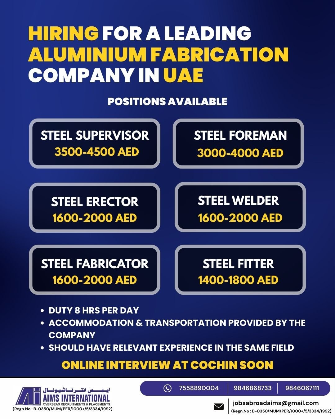 We are seeking experienced steel professionals to join a leading aluminium fabrication company in UAE. The company offers a competitive salary and benefits package, including accommodation and transportation. The ideal candidates will have relevant experience in the same field and be able to work 8 hours per day.
