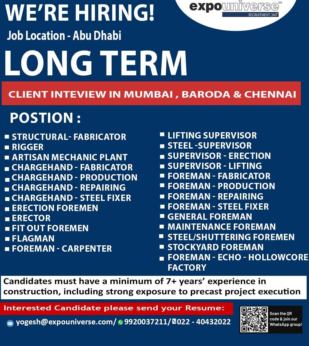 We are seeking experienced candidates for various positions in the construction industry, specifically in precast project execution. The ideal candidates will have a minimum of 7+ years of experience in construction. The job location is Abu Dhabi, with client interviews to be held in Mumbai, Baroda, and Chennai.