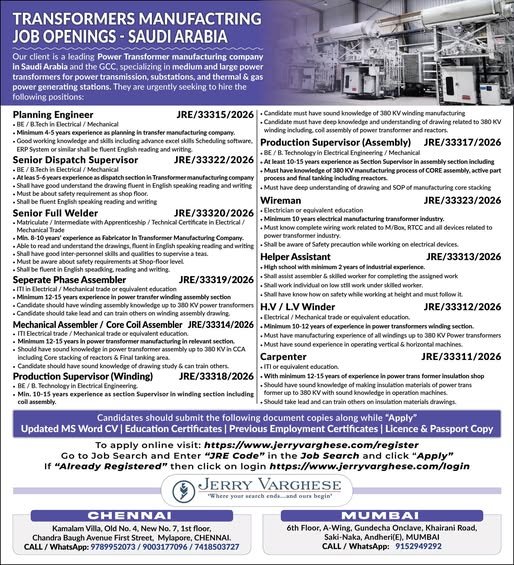 We are seeking skilled professionals to join our team in Saudi Arabia for various positions in transformer manufacturing. The ideal candidates will have experience in production, assembly, and supervision. This is a great opportunity to work with a leading manufacturer and contribute to the growth of the industry.