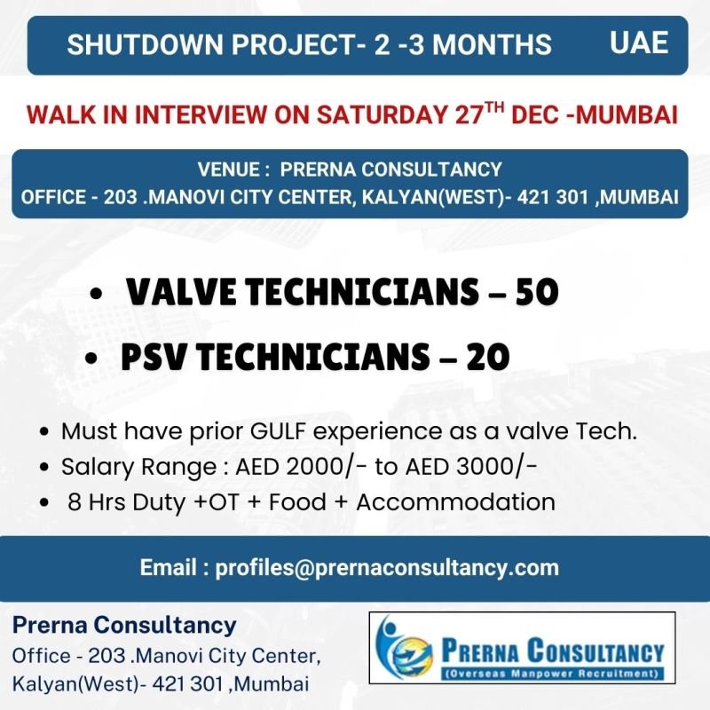 We are seeking experienced technicians for a shutdown project in the UAE, with a duration of 2-3 months. The ideal candidates will have prior experience working in the Gulf region. The selected candidates will be offered a competitive salary and benefits package.